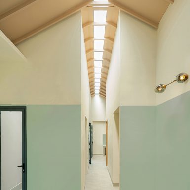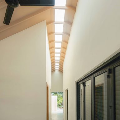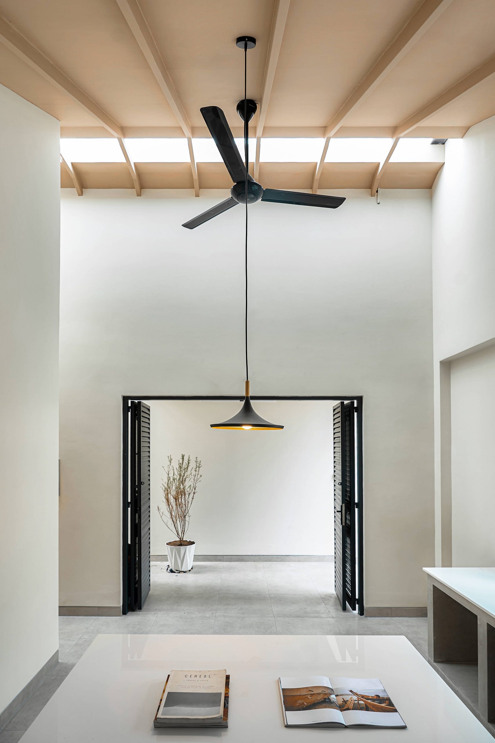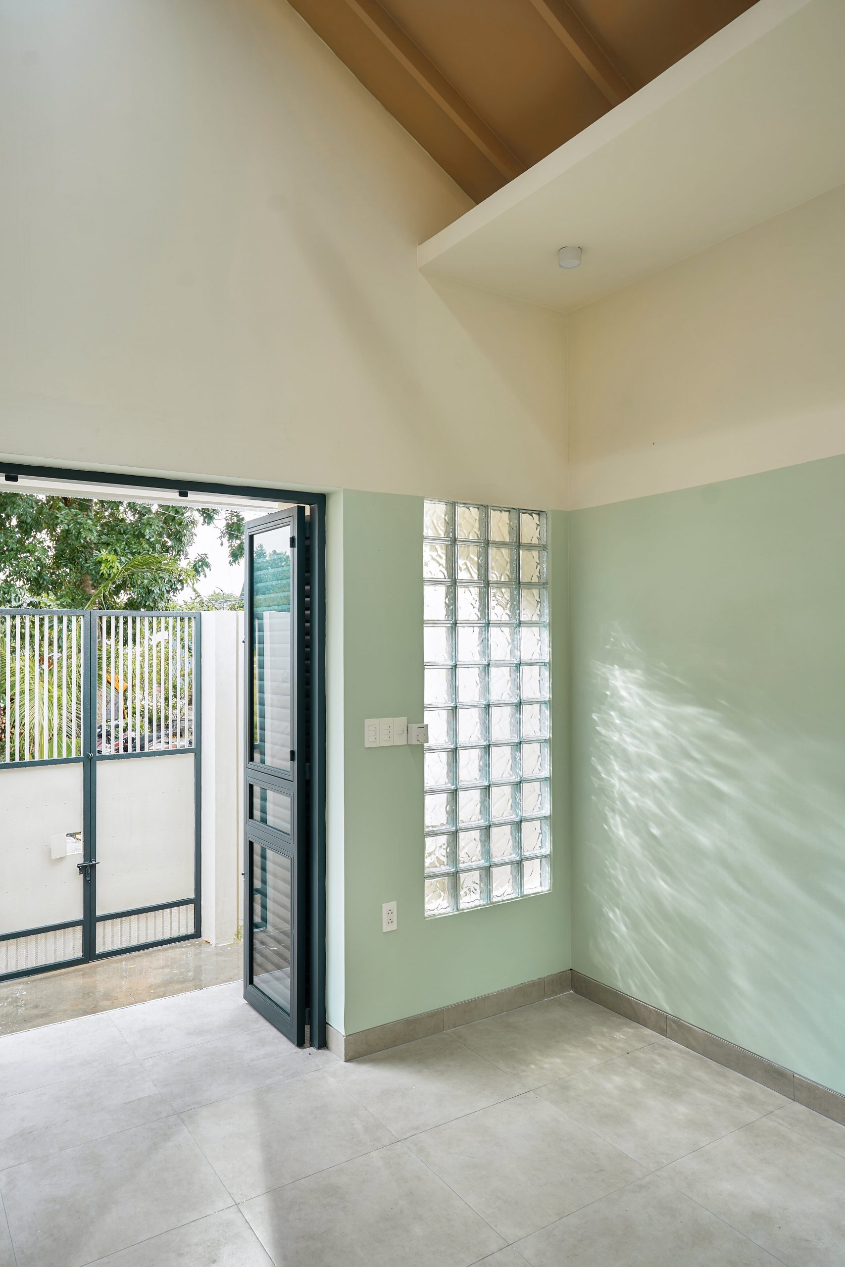 Vật liệu được sử dụng trong nhà được lựa chọn tỉ mỉ để phù hợp với bối cảnh xung quanh. Mái lợp tôn với hệ dốc lớn và cao giúp ngôi nhà tăng sự thích nghi với điều kiện thời tiết ở địa phương, gỗ tự nhiên đóng vai trò chủ đạo trong nội thất, tạo nên sự ấm áp và gần gũi với thiên nhiên. Bên cạnh đó, các yếu tố trang trí như cây xanh và ánh sáng tự nhiên cũng được chú trọng để tạo điểm nhấn và mang lại cảm giác nhẹ nhàng, thư thái.
