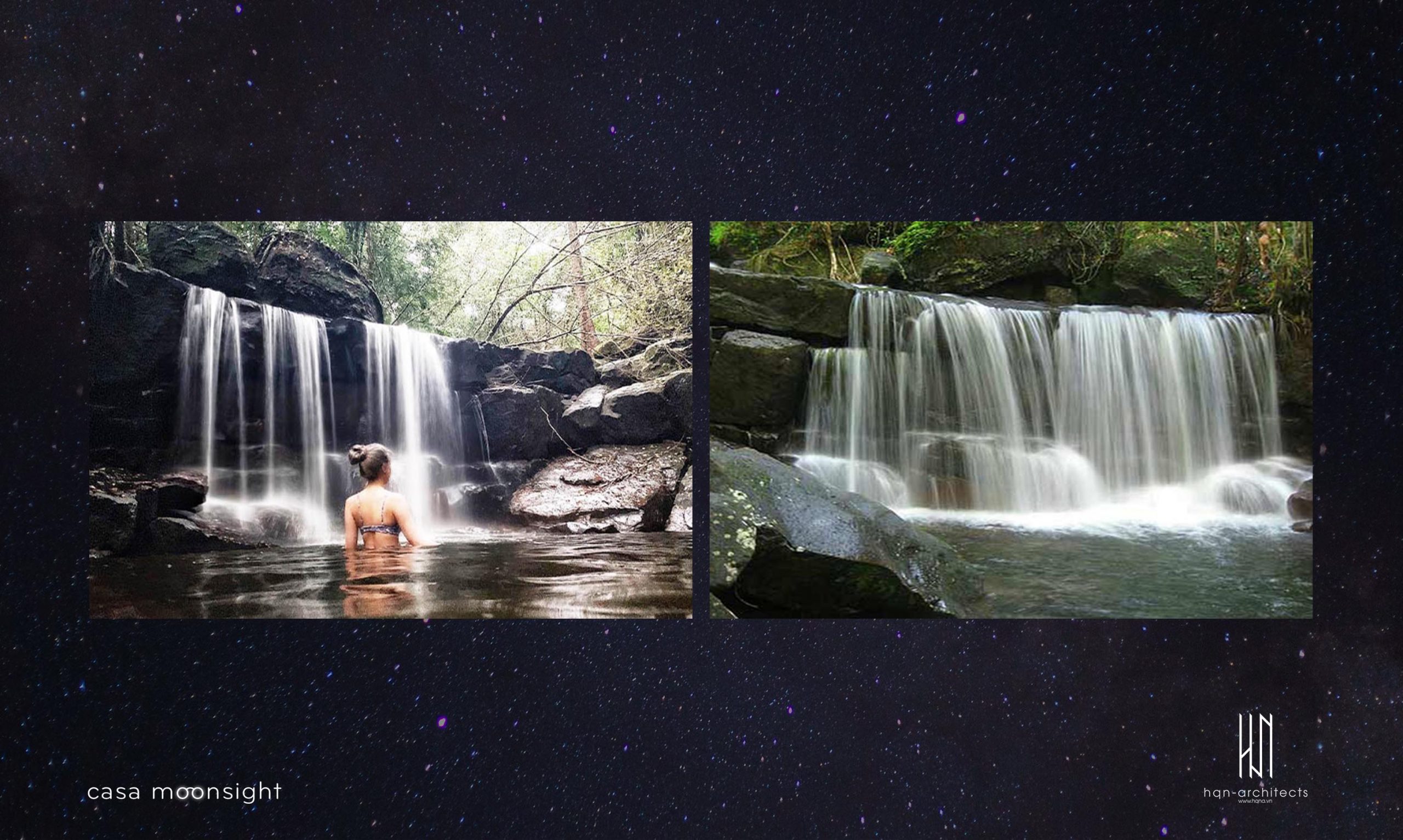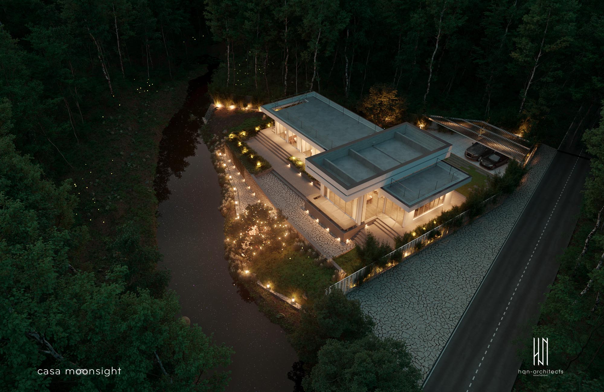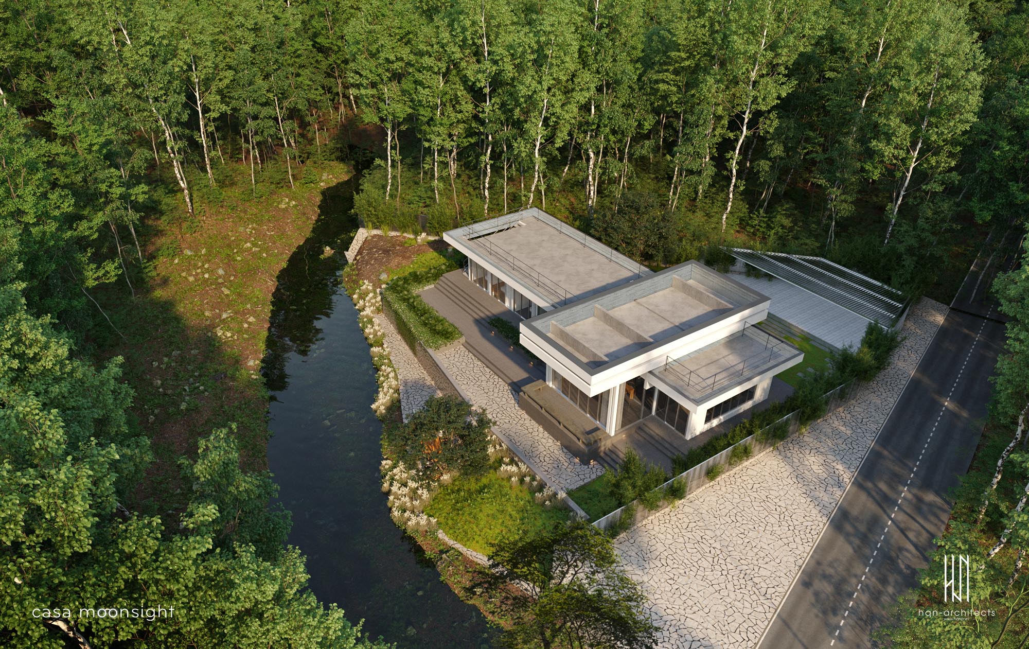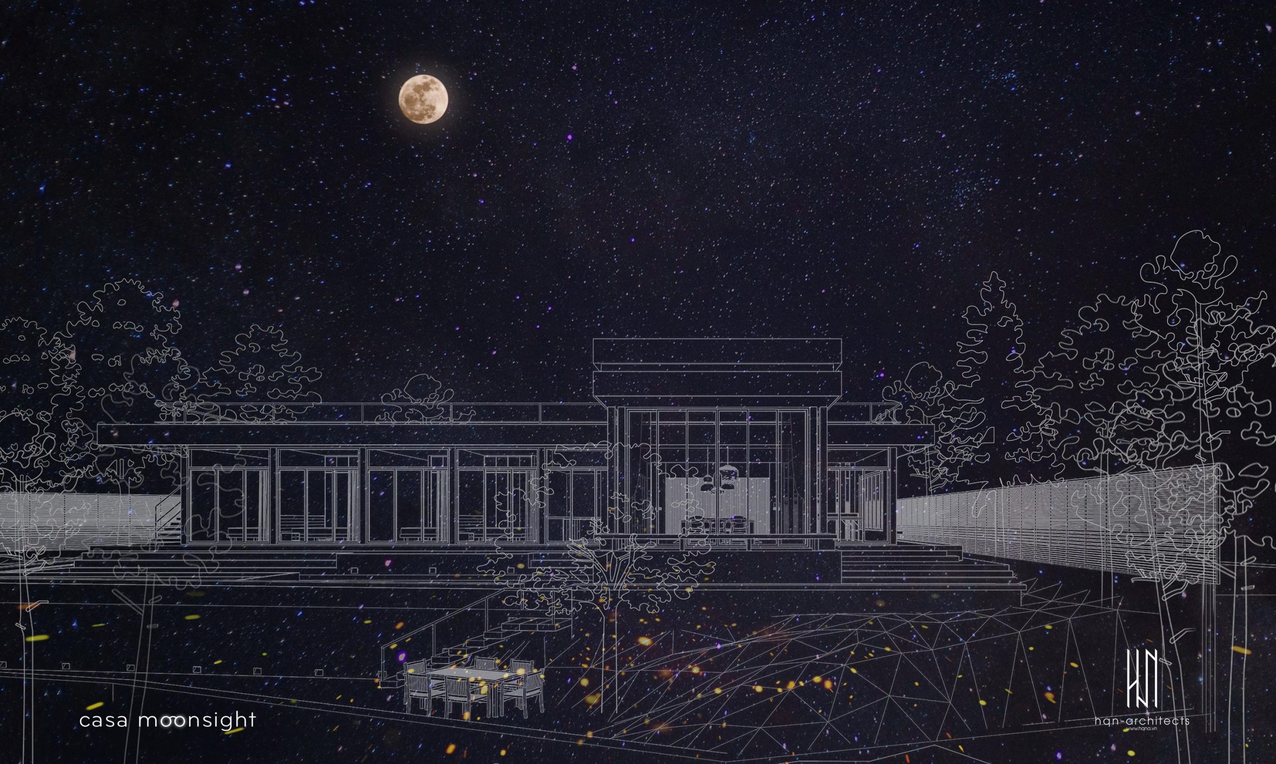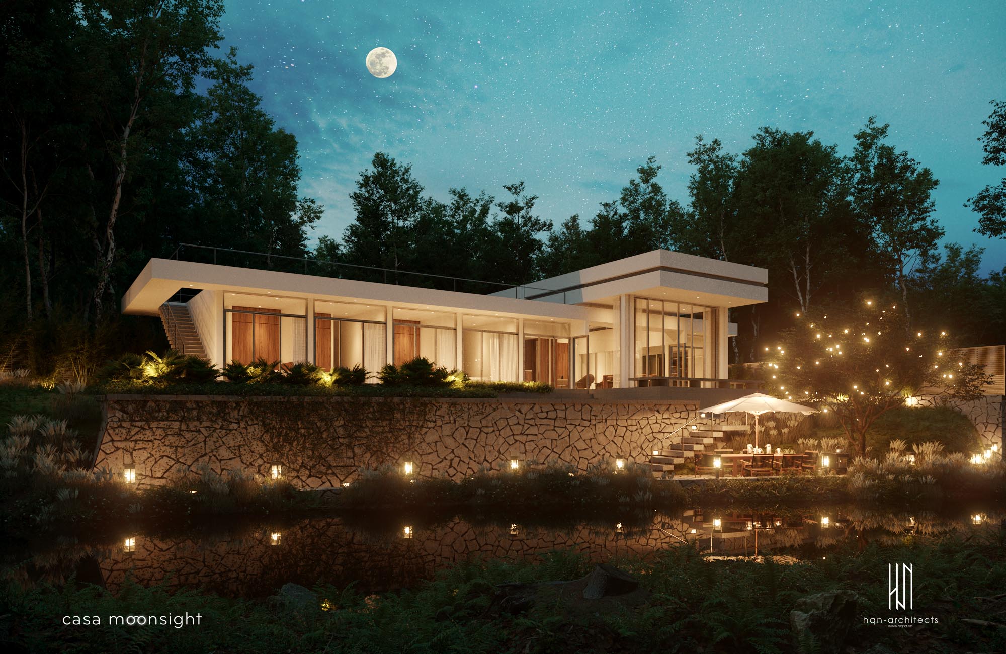 Casa Moonsight là tổ hợp kiến trúc giữa các khối sinh hoạt và nghỉ dưỡng cùng nhìn về phía bờ suối, nằm trải dài theo hướng đông nam để tránh các hướng nắng trực tiếp. Trên nền đất thoải nhẹ bên cạnh cánh rừng, chúng tôi kỳ vọng ngôi nhà sẽ là một phần của nơi đây, khúc chiết và tự nhiên, tựa như những phiến đá xếp chồng lên nhau tạo nên dòng chảy dưới con suối.