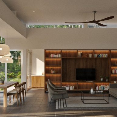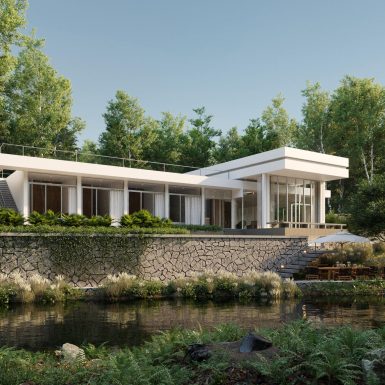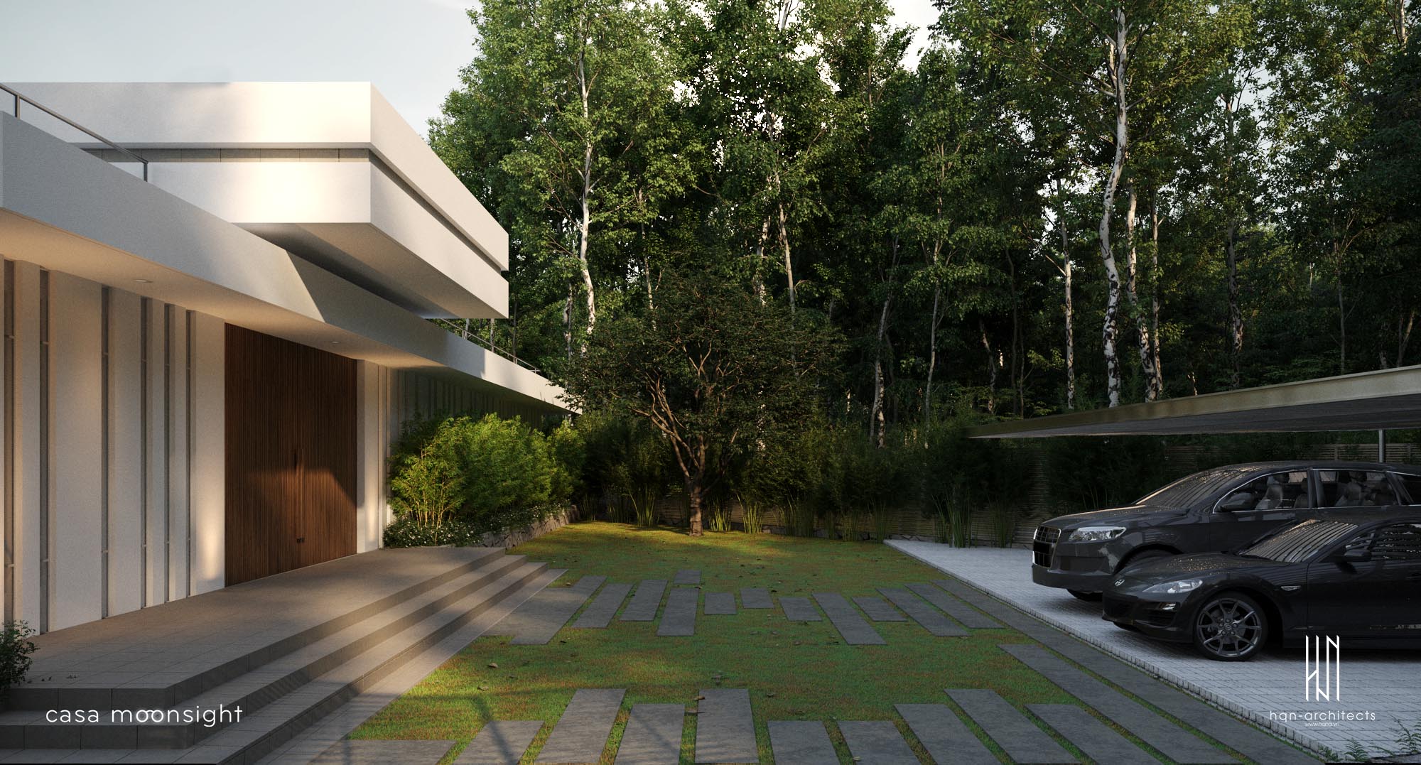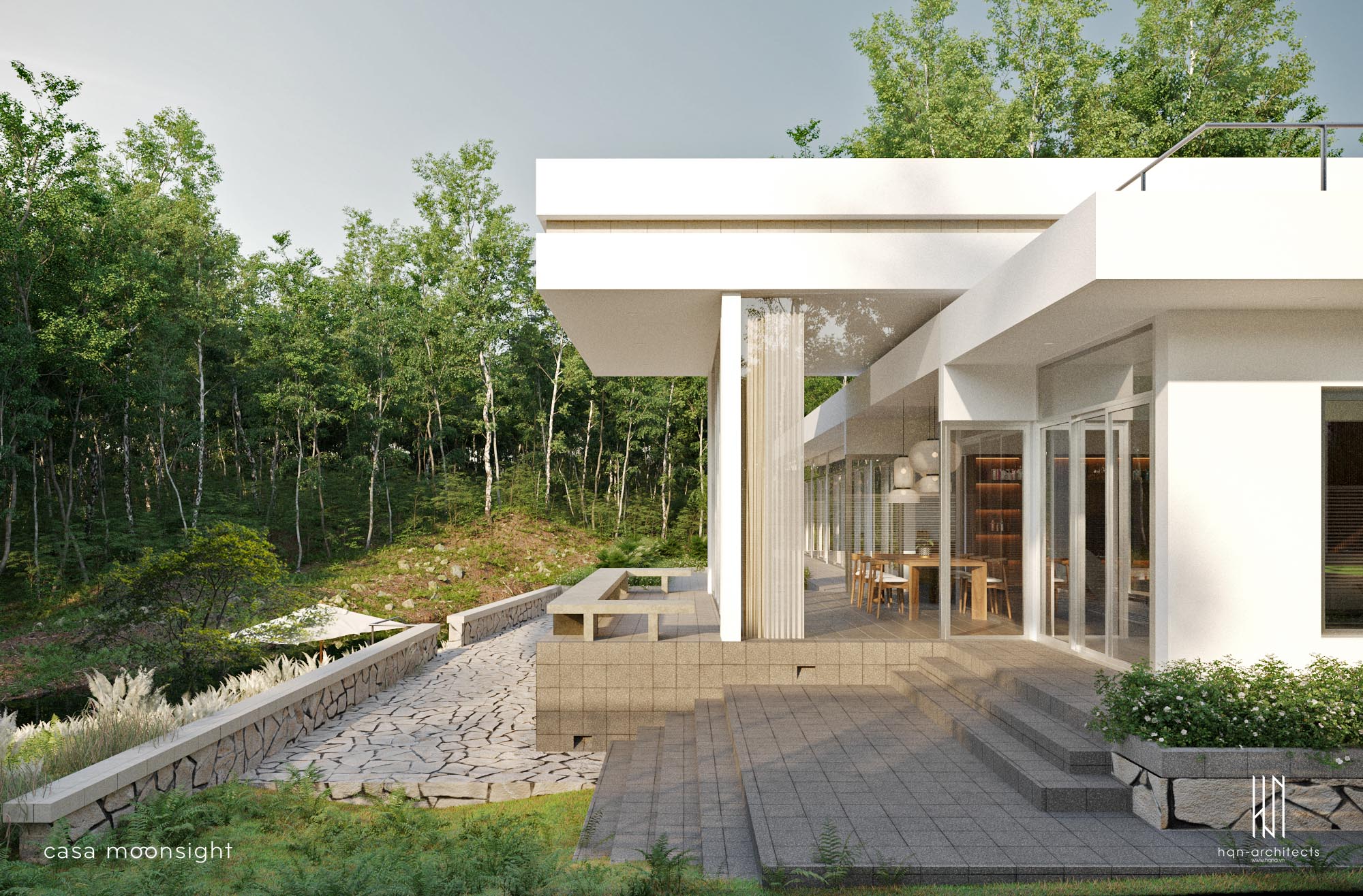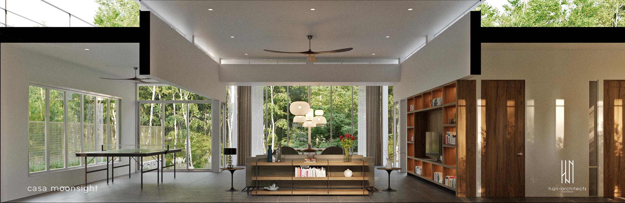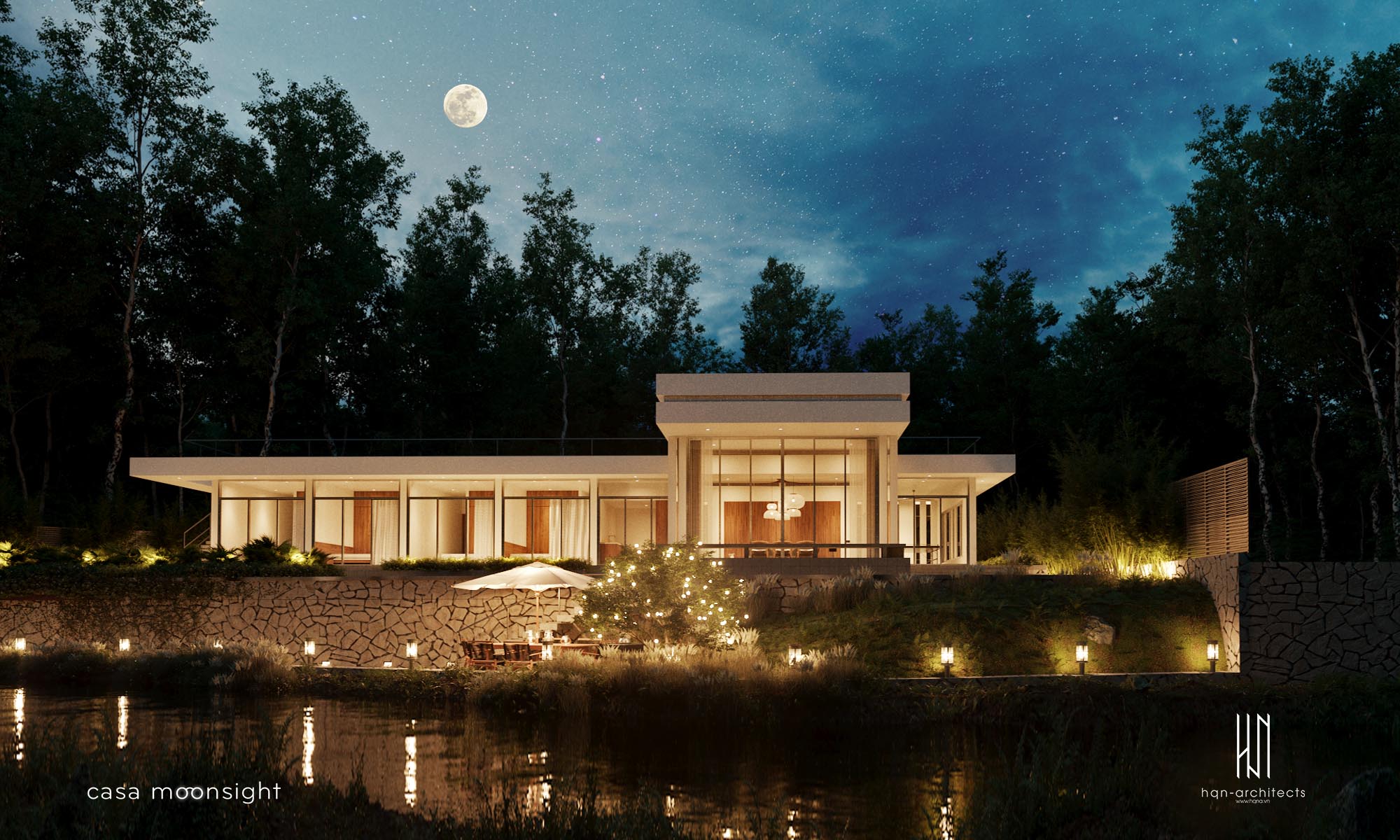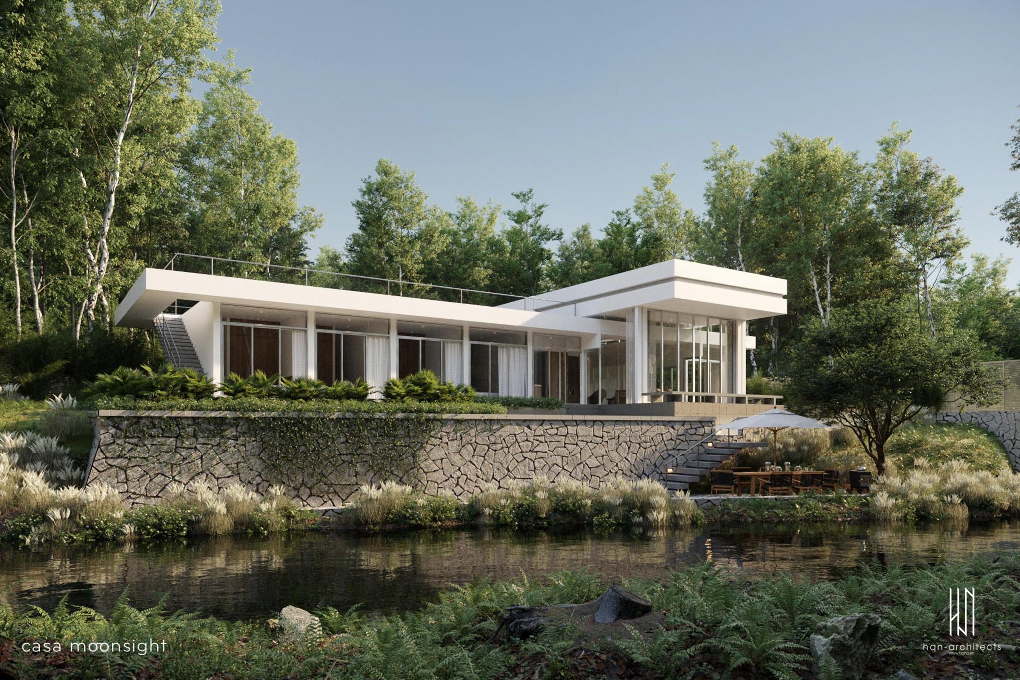 Casa Moonsight là tổ hợp kiến trúc giữa các khối sinh hoạt và nghỉ dưỡng cùng nhìn về phía bờ suối, nằm trải dài theo hướng đông nam để tránh các hướng nắng trực tiếp. Trên nền đất thoải nhẹ bên cạnh cánh rừng, chúng tôi kỳ vọng ngôi nhà sẽ là một phần của nơi đây, khúc chiết và tự nhiên, tựa như những phiến đá xếp chồng lên nhau tạo nên dòng chảy dưới con suối.