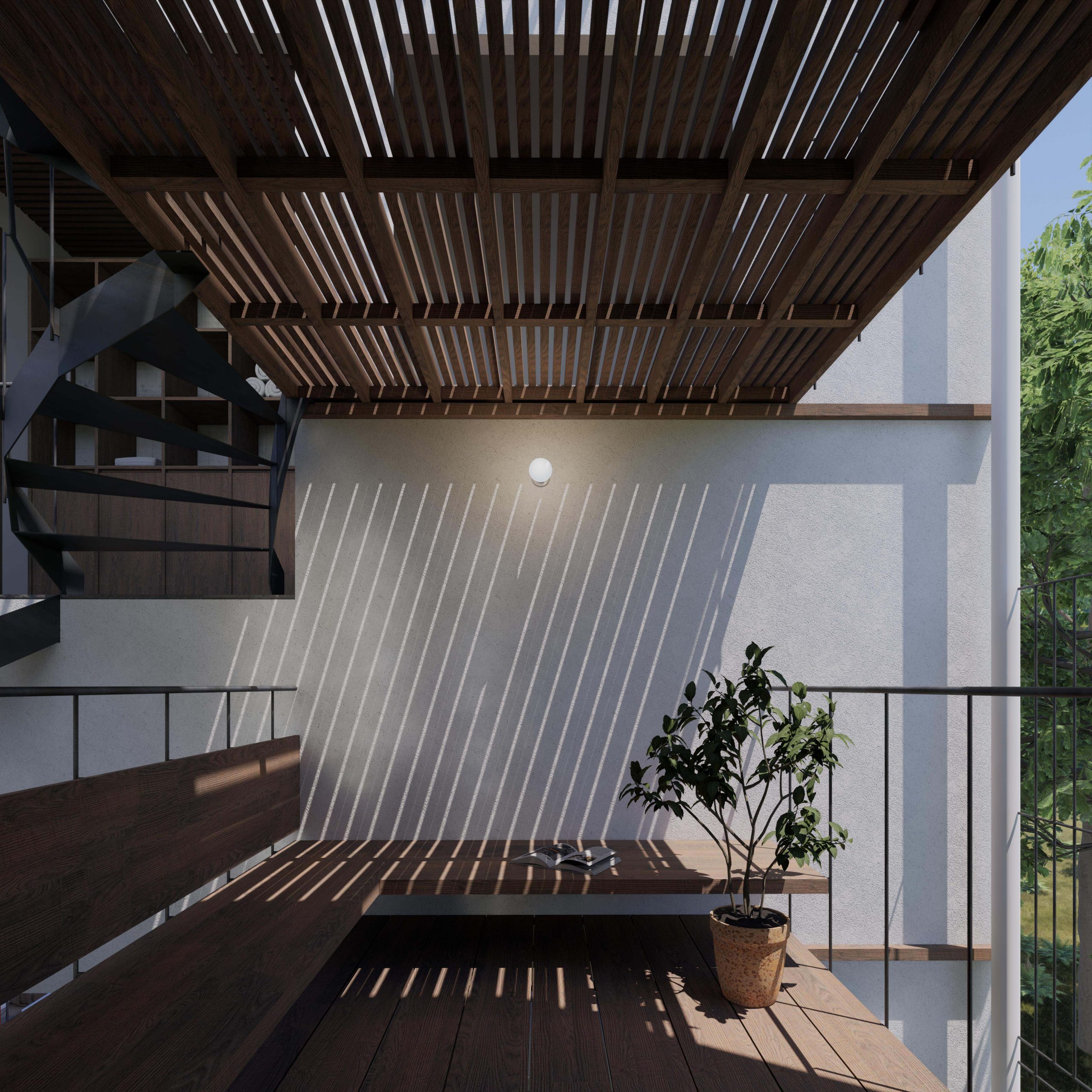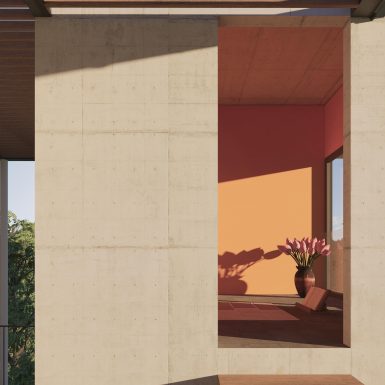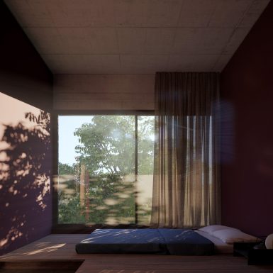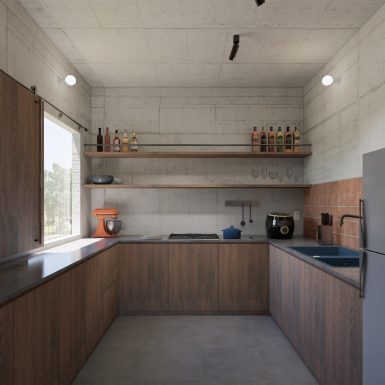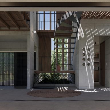 Cách tạo hình của ngôi nhà hướng đến việc kiến tạo hình thức tối giản và cảm quan thô mộc, bao bọc các không gian là lớp kết cấu của bê tông thô, nổi bật cùng tính chất linh hoạt của bề mặt vật liệu gỗ. Các diện tường càng được nhấn mạnh hơn nhờ sự chuyển giao giữa ánh sáng và bóng tối, từng lớp lang của vật liệu và nét bóng đổ bổ trợ lẫn nhau, tạo nên chiều sâu cần thiết cho không gian.